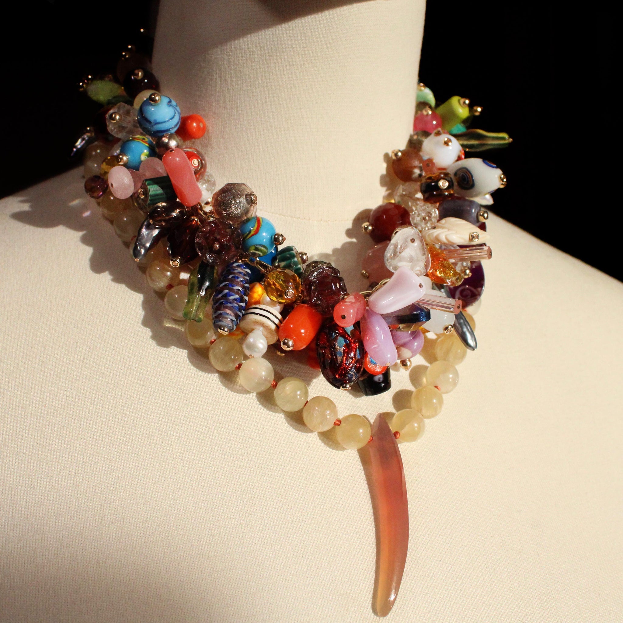 Layers, chapters, eras, decades — history. The Tall Tale Charm Necklace belongs to our Origin collection, a celebration of designs from our founder’s formative years. This necklace carries an extraordinary lineage of antique and vintage bead charms — from cake glass and millefiori trade beads to rare finds gathered across time and place. Finished with vintage brass chain and an antique clasp, it’s a living archive — a story told in color, form, and memory.