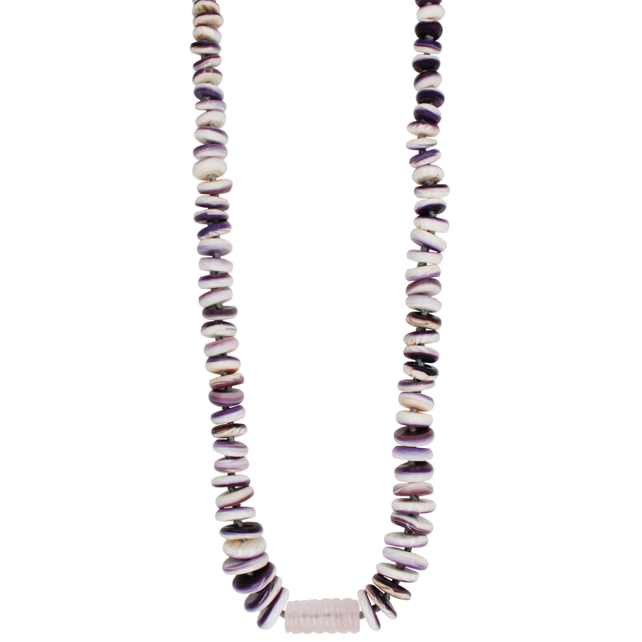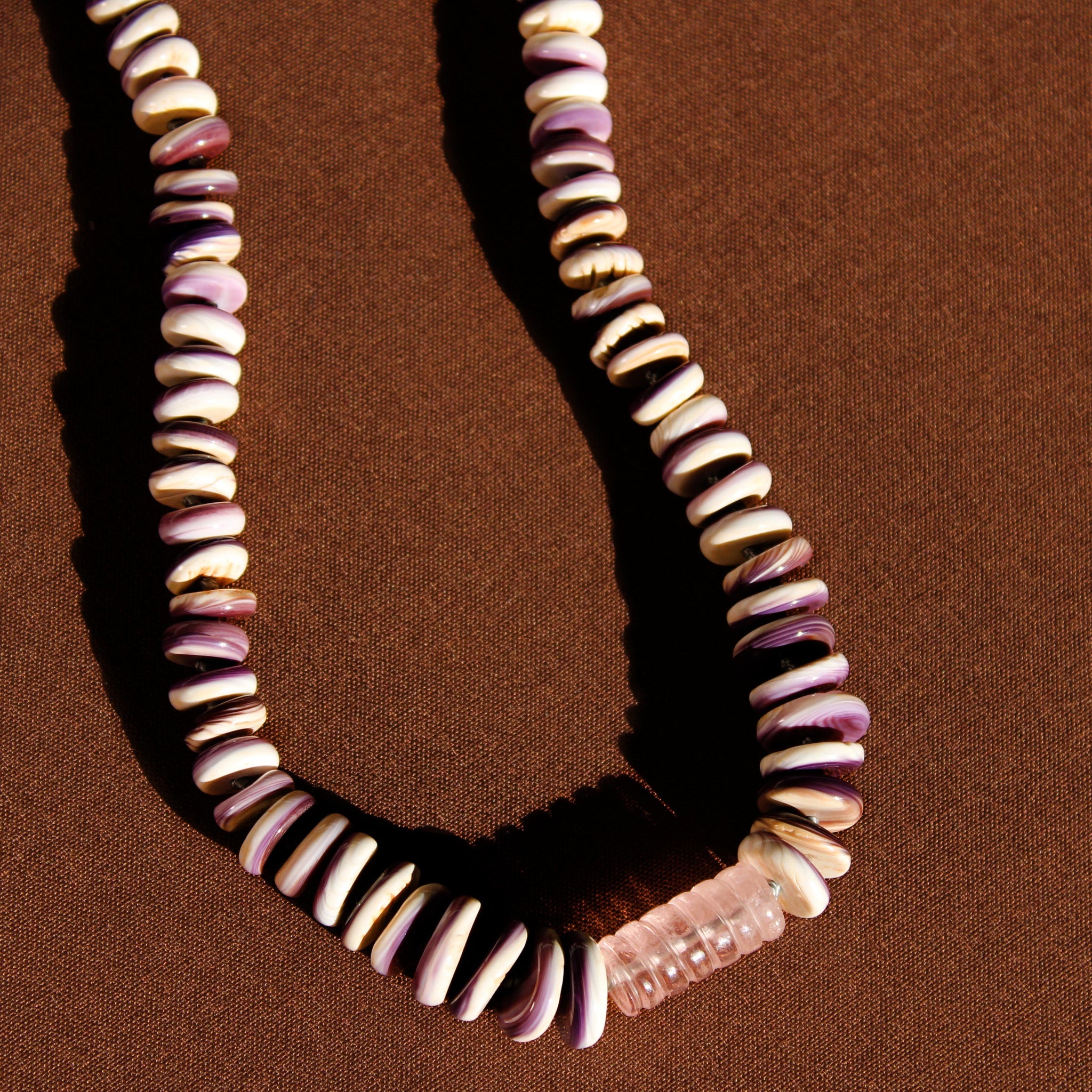 Graduated wampum shell beads are hand-knotted on gray Japanese polyester, their natural tones shifting softly from inky purple to light sand. The strand ripples in size toward a carved pink beryl focal — carved into a twisted cylinder that anchors the piece with quiet, sculptural grace. Handmade in the United States.