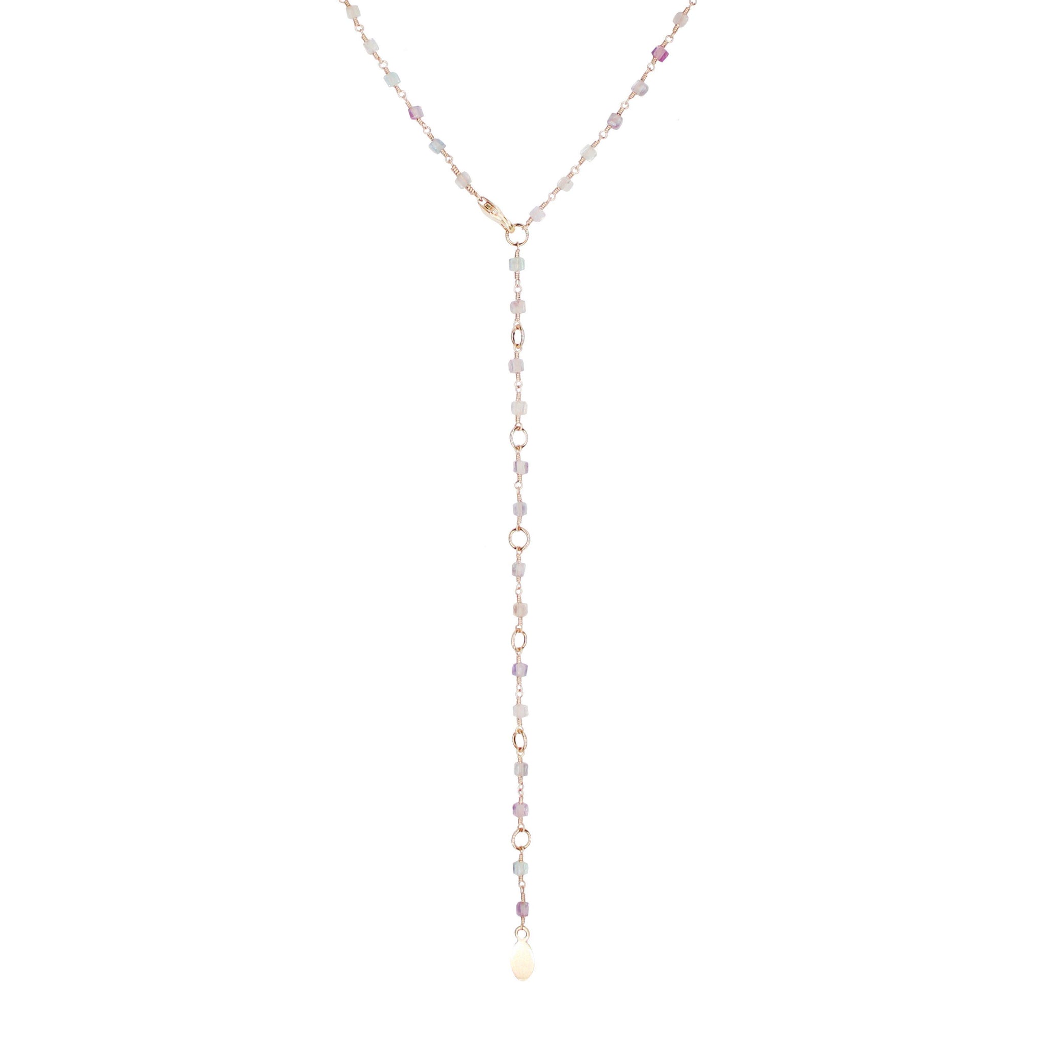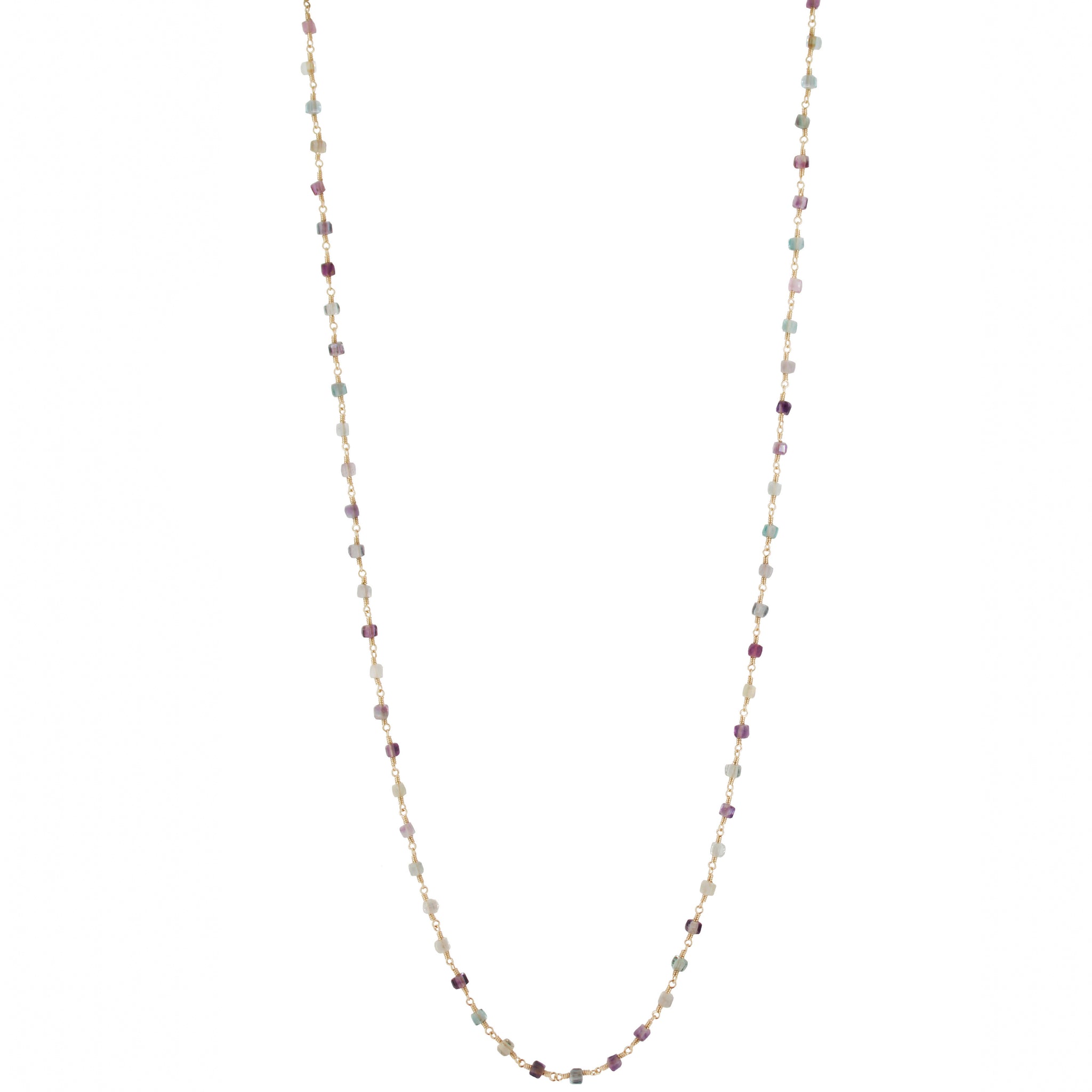 Our Sacred Strand features micro-faceted fluorite cubes, strung with meticulous attention to detail on 14k gold fill. Fluorite is known as a stone of clarity and protection, supporting mental focus, intuition, and energetic balance. With its naturally shifting hues and luminous depth, this delicate strand brings a vibrant, kaleidoscopic beauty to any collection. Handmade in the United States.
