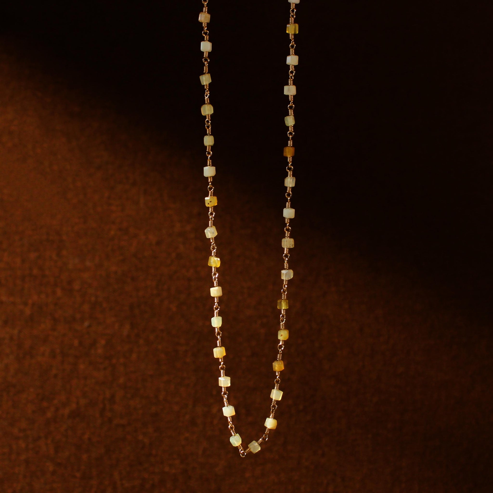Our Sacred Strand features micro-faceted yellow opal cubes, strung with meticulous attention to detail on 14k gold fill. Yellow opal is celebrated for its uplifting energy, encouraging creativity, joy, and emotional balance. With its soft golden glow and subtle shimmer, this delicate strand brings warmth and light to any collection. Handmade in the United States.