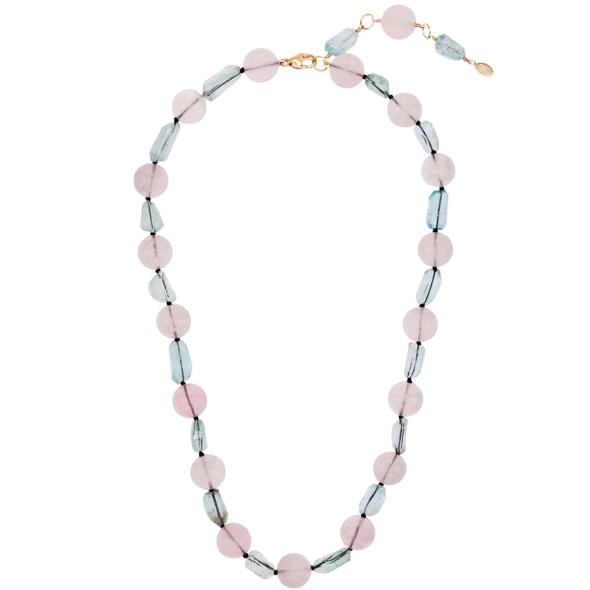 Inspired by the insight of the oracle, the Sybil Necklace combines luminous rose quartz rounds with organically faceted blue aquamarine nuggets, meticulously hand-knotted on Japanese polyester for a flawless drape. Finished with a stoned extender, this modern, chic necklace radiates understated sophistication. Rose quartz fosters love and emotional balance, while aquamarine encourages clarity and calm. Handmade in the United States.